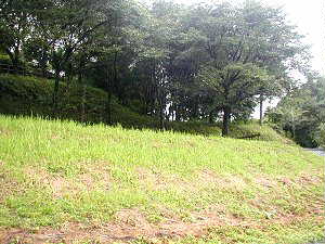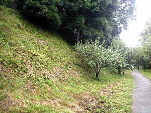 | 東北道との間の駐車場から上に段々と並んだ腰曲輪群を見た所である。この方面が重厚な配備になっていることからすると、大手もこちら側にあったのかもしれない。 | (う)の腰曲輪である。この城内には梅がたくさん植えられている。桜ではなくて梅を植えている城址公園は珍しい。しかし、この日は雨で傘を差して回っているため、背の低い梅ノ木はとても邪魔なのであった。 さて、この位置まで来ると左側の土手が本丸の城塁のように見える。しかし、実際の本丸は土橋を隔てた向こう側にあり、この位置からでは見ることができないようになっている。 |