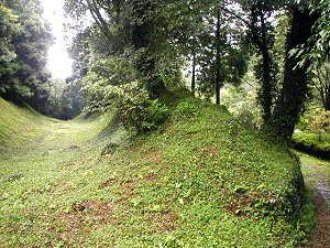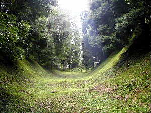 | Aの巨大横堀の城塁。高さ8mほどある。 | Aの横堀内部。幅は20mほどもあり、とにかくでかい! |