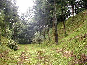 | 1郭から2郭に接続する土橋状の坂道。わりと単純な坂虎口だが、子の地域ではよく見られる構造である。 | 2段横堀の上の横堀。2段目との城塁の高さは10m以上ある。 |