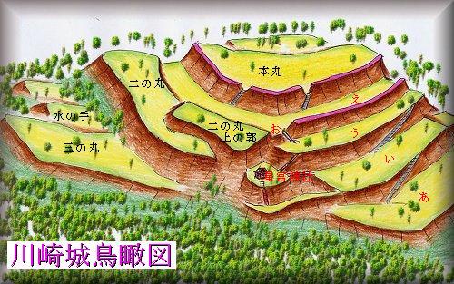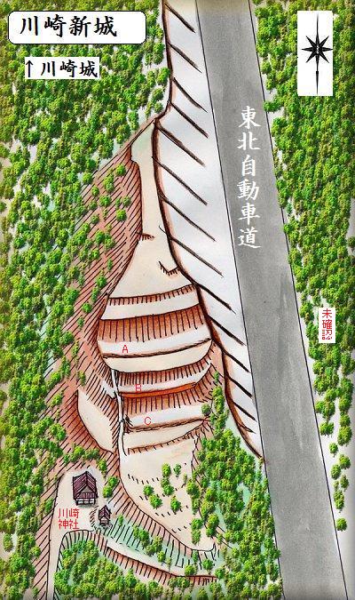 川崎城は、現在川崎城跡公園となっているので、場所はすぐ分かる。近くまで行くと、目立つ四つの看板で「川」「崎」「城」「跡」と示してあるので、これを目的にしていけばすぐ分かるであろう。比高30mほどの台地である。鳥瞰図は西側上空から見た所。ちょうど手前の森の辺りに東北自動車道が南北に通っている。