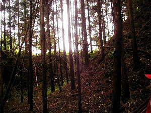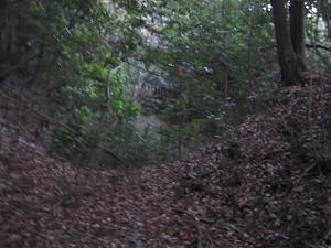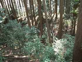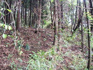 | 1郭南側の2郭(馬出しのようなものか)の正面の堀切と虎口。写真では実感は湧かないであろうが、堀切は深さ7m、幅15mほどはある非常に大規模なものである。 | 左の虎口脇の竪堀。粘土質の土壌が削られており、とても登ってくることはできないような竪堀となっている。 |