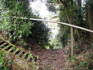 神社へは南側に新しく切り通された道と、東側の石段の両方からアクセスすることができる。といっても、これらはいずれも本来の登城道ではないと思うのだが、本来の道はどこにあったのであろうか。あるいは横堀内部を通って、1郭の尾根側に出るようになっていたのかもしれない。