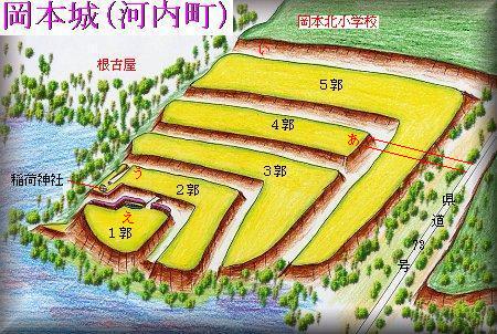 岡本城は、岡本北小学校の北側一帯にあった。地図にも掲載されているので、場所はすぐに分かるであろう。東側の鬼怒川に続く低湿地に南側から突き出した比高15mほどの台地の先端部を利用した城郭である。