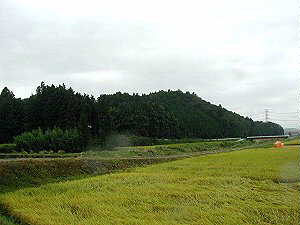 | 逆面城は、山田川に臨む比高25mほどの台地上にある。県道63号線が159号線と分岐する信号があるが、その交差点にはよく見ると西側に入っていく道もある。ここを西に進むと山田川を渡る橋の所に来るが、その橋を渡るとすぐに、道路わきの案内板が見えてくる。 写真はその橋の辺りから城址を遠望したものである。 |
