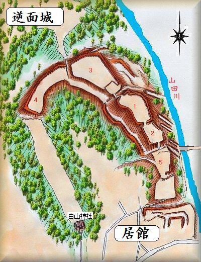 案内板によると、逆面城は、宇都宮氏の家臣であった逆面氏によって室町時代に築かれたものであるという。略即図を見ると、先端近くに方50mほどの本丸と2の丸とがあり、その周囲を横堀が取り巻いている。尾根続きには「馬乗りばんば」と呼ばれる細長い、土塁に囲まれた郭がある。他にも腰曲輪などがあるようだが、主にこの3つの郭で構成された城らしい。麓に居館もあったというが、なるほど、それらしい土手も見える。 |