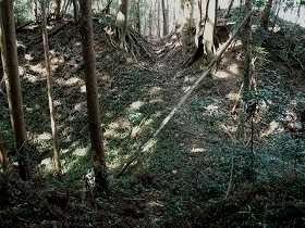 2郭と3郭との間の切通し道。図で(う)の少し先の部分である。深さ2m、幅5mほどであるが、これはかつての堀の名残であろう。
