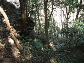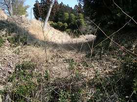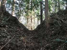 | 1郭北側の虎口。出たところが土橋になっている。 | 1郭西側下の横堀を土塁上から見下ろした所。深さ10mほどもある、圧倒的に巨大な横堀である。まさに規模雄大! |