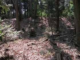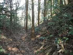 | 南側山麓にある居館部の堀切と土塁。 | 居館部の土塁。 |
