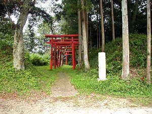 芭蕉の館の南側にも郭が続いているが、周辺部はきちんと歩いてはいない。そのため形態を十分に把握してはおらず大分想像が混じってしまった。現在駐車場となっている(う)の郭も大手道と街道とを押さえるための重要な部分であったろう。この街道沿いの150mほど南側に稲荷神社(え)があるが、この両側に土塁がある。この土塁は神社のために造られたものとしては規模が大きい。これも街道を押さえるための虎口にあった二重土塁だったのではないだろうか。