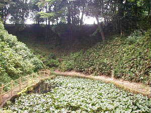 上の橋から堀の北側を見てみた。堀がクランクしながら延びているのがよく分かる。堀に沿って外側には土橋が築かれている。