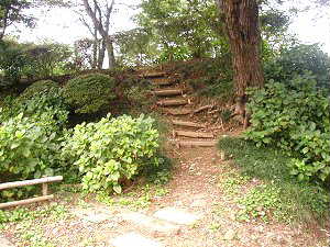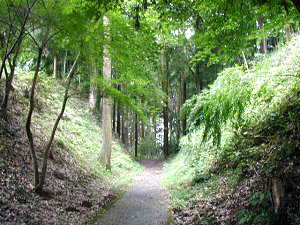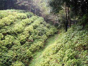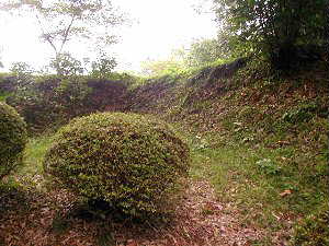 街道から3mほど上ると、1つ目の枡形があり、そこから右に2mほど上ると2つ目の枡形がある。2段連続構造の枡形である。写真は2つ目の枡形の周囲の土塁。ここをさらに進むと本丸の東側の枡形虎口に続いていく。