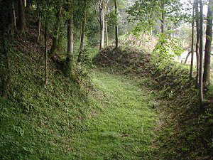 これが、稲荷神社(え)の脇の二重土塁。高さ3mほどで、街道を閉塞するように並行して築かれている。街道を押さえるための虎口の仕掛けの1つであったのではないかと思われる。