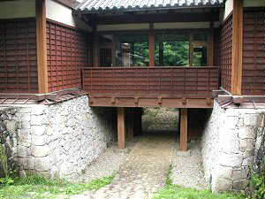 馬出し郭の方から3ノ丸「芭蕉の館」に接続する部分には写真のような地下接続式の虎口がある。芭蕉の館方向から見たもので、上の建物は芭蕉の館の建物の一部である。両側の石垣は新しく、明らかに近代のもの。馬出し郭との接続部分が本来どのような形状であったのかは知るよしもない。これが旧状であったと思っては早計であろうが、面白い構造である。