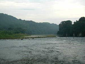 那珂川の対岸から、黒羽城方向を見てみた。写真中央奥のやや右よりの辺りが本丸である。