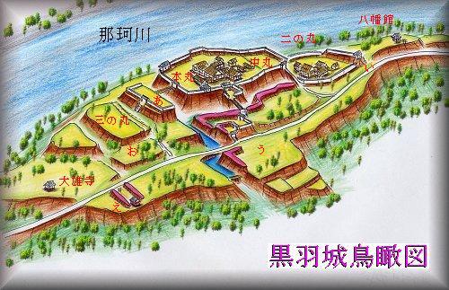 鳥瞰図は東南上空から見たものである。基本的には連郭式の城郭で、本丸、馬出し郭(あ)、3の丸(現在芭蕉の館がある所)などが、城内最高所にあたる。この辺りが城の原型であろう。黒羽城は近世に入ってからも用いられていたので、その周辺にも城郭的な構造や城下町が営まれていた。
