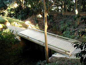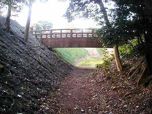 空堀に架かる木橋。(う)の郭と台地基部との間に架けられている。この部分は堀の規模も小さい。