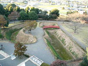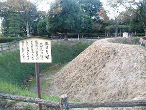 1郭の外側にある丸馬出と三日月堀。規模はさほど大きなものではないが、明瞭に三日月堀だと分かる遺構である。畑になって埋められていたものを、古図に基づいて復元したものであるらしい。