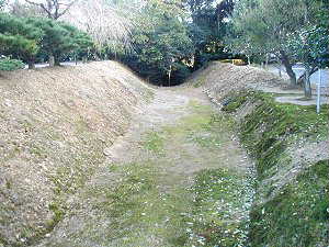 大手ニノ門辺りの堀の跡。幅10m余りである。橋が復元されている所に、往時の橋もあったのであろうか。