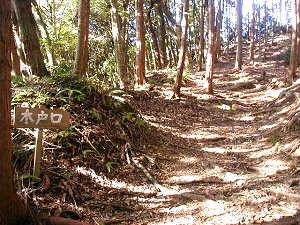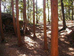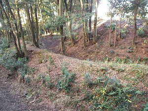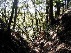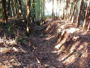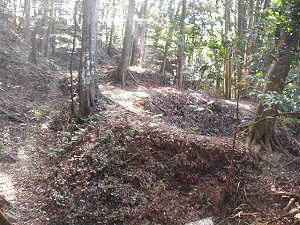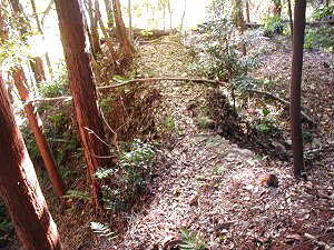 能満寺から上がっていくと虚空蔵堂のある郭に出るが、そこを進んでいくと1郭の空堀にでることになる。深さ3m、幅6mほどの堀である。それほど深くもないし、城塁もわりと緩やかである。こんなもので防備の要を成したのであろうか。