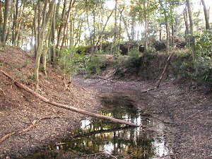 三重堀の東南側には(う)の郭がある。案内板ではこれも「馬出し」とあるが、実際の所、どうなのであろうか。馬出しというよりは、脇の土橋を通る敵を側面から迎え撃つための郭といった感じの場所である。ただし、(う)の周囲は堀の幅も5mほどしかなく、深さも2m余りであり、防御的には弱点になりそうな気がする。