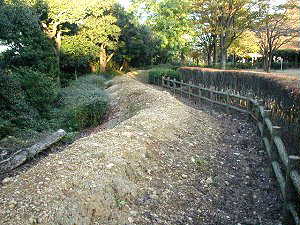 2郭の外側の堀。いかにも復元したという感じの土塁の積み方をしている。深さ2m、幅3mほどと規模は小さい。あっという間に乗り越えられそうな堀である。