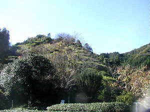 駿河匠宿方向から見た丸子城。ここから比高100m余りある。ここから取り付くと、東端の稲荷神社のところに出る。大手道といった所であろうか。