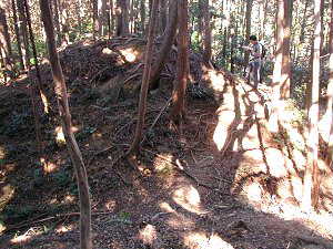 1郭南下の尾根には5段にわたって小規模な郭が連続している。それぞれの郭の間にはかなりの急斜面の落差があることから、武者たちが溜まるところというよりは、緩やかな斜面に切岸を造作した名残のものと見た方がよいかもしれない。写真は8の郭の脇にある土塁。この脇には竪堀もある。