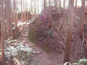 1郭の東側の端には土塁で囲まれた枡形状の部分がある。この先は2郭との間の堀切であるが、2郭部分には出っ張りがあり、ここに橋脚が架けられていたようである。また、1郭の東南の尾根下は、5段に渡って半月状の腰曲輪を配置している。こちらの斜面がもともとは緩やかだったのを、こうした構造にすることによって、斜面を急峻にして取り付きにくくなるようにしたものである。