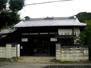 さて、城下に降りてみよう。写真は現存する陣屋裏門。城址の南500mほどのところの道路沿いの民家に移築されている。形状は長屋門だが、左側は屋根が片切妻破風の小屋のようになっている。これは移築されてから改造されたものかと思ったのだが、現地の説明版には「この長屋門は左右対称ではなく、右側に中間部屋、左側に馬小屋を置いていた」とあった。左右非対称なのはもともとの構造であったらしい。長屋門としては珍しい気がする。 |