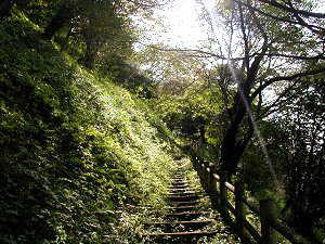 | 下の「那須歴史探訪館」から城に上って行く道。上記の通り、本来の登城道は南側にあったと思われるので、これは搦め手に当たる。公園化に伴って、だいぶ形状が変えられている可能性もある。 それにしてもこちら側の城塁が急峻なのがよく分かるショットであろう。下の駐車場がら陣屋のあった広い郭までの比高差は18mほどである。 |