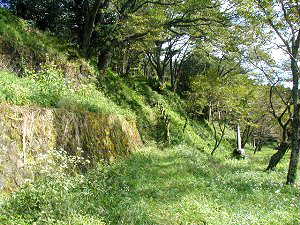 | 最初に見えてくる横堀。一直線に長く延びている。 | 腰曲輪の城塁。上の方に1郭の城塁がかすかに見えている。 |