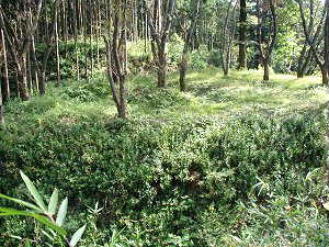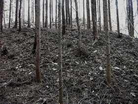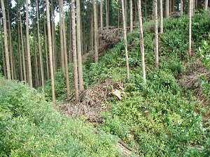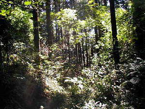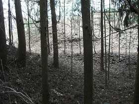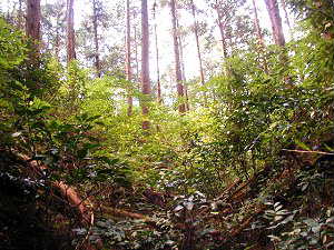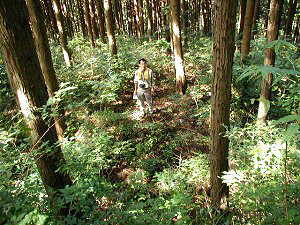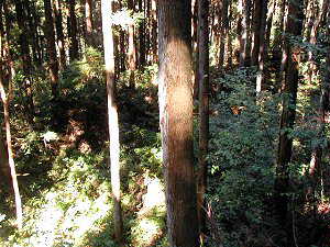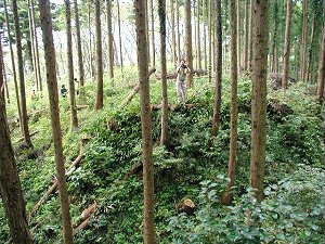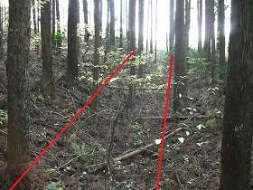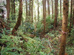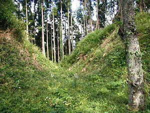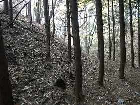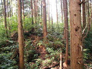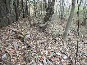 | 1郭と2郭との間の堀切。これまた山林の写真にしか見えないが、両脇は城塁である。左側が2郭である。 |