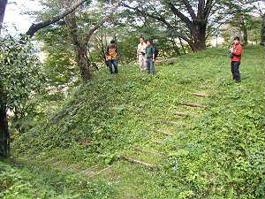 | 1郭と2郭との間の堀切。深さ6m、幅8mほど。左の1郭側の方が1m余り高いのが分かるであろうか。 | 1郭北側の(う)の小郭から、堀切越しに1郭を見る。レンジャー部隊の隊員たちが集結している。みな一騎当千のつわものである。 |