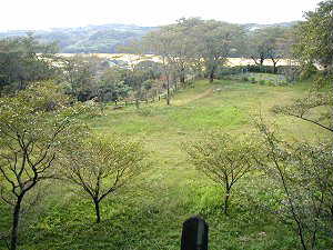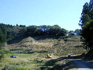 | 国道294号線沿いに「霞ヶ城」の案内板があるが、そこのところから入って行くと、すぐに写真の4郭城塁が目に入ってくる。いかにも城山的な風景である。斜面にはつつじでも植えているのであろうか。植林真っ最中である。 |