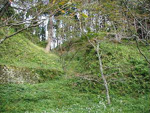 上の登城道をあがって来ると、裏門のところに出る。左側には1郭の城塁、右側には土塁があった。陣屋のあった郭から1郭までの比高差は9mほどである。 |