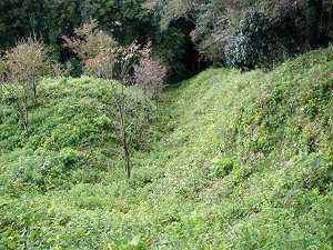 北側の山との間の谷戸部を進んでいくと、いきなり左側に堀切が見えてくる。最初の堀切である。深さは2m程度であるが、長さは、50mほどもある。南側に進むにつれ深くなっており、北側の山稜とつながっている南側の尾根部分の接続部では、深さが3mほどもある。
