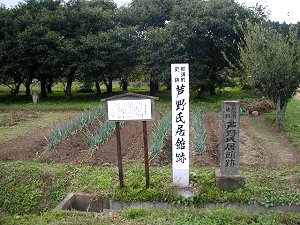 芦野城の西600mほどの水田中に芦野氏館跡がある。県道72号線沿いに入口表示もあるので、場所はすぐ分かるのであるが、現状では遺構らしきものは見られない。案内板には「周囲の一段低い水田が水堀の跡である」とあったが、耕地整理がかなり徹底して行われたのか、ほとんど堀らしい窪みも土塁のような高まりも見られなかった。もともとは方100m余りの単郭方形の居館であった。 芦野氏がこの地にいつ居館を築いたのかははっきりしないが、「吾妻鑑」に「葦野地頭」とあるのが、この芦野氏のことと考えられている。 |
