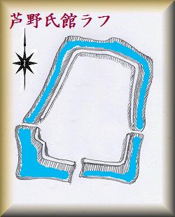 国道を挟んで芦野城と向かい合う位置には芦野氏館があった。現在、芦野氏館の土塁は崩され、堀は埋められているが、実測図を元に想像すると、こんな感じであったらしい。