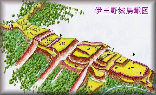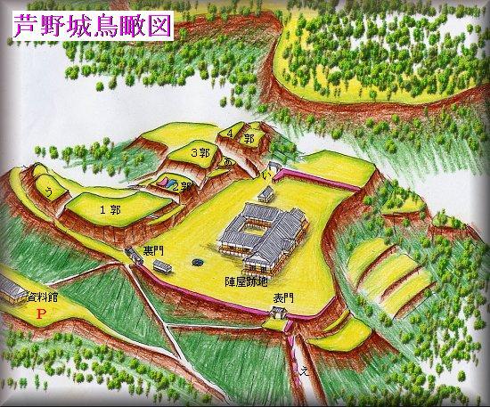 鳥瞰図は南西上空から見たものである。城山の北側には比較的規模の小さな郭が東西に4つ並んでいる。これらが城の中心部であろうと思われるが、すべてあわせても拠点的な城郭とするにはスペースが足りない。そこで、下に広場のような平坦地を設けている。この部分はもともと広かったのか、山をそうとう削って造り出したのかは分からないが、実質的に、この広い郭が城の主要部となっていたのであろう。城主の居館はここにあったのではなかろうか。また、天文年間に本格的築城が行われる以前に、この上の部分を利用した小規模な連郭式の城郭がもともとあったのかもしれない。