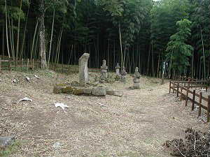 | 下の道からちょっと上がったところにある芦野氏の墓所。かなり由緒のありそうな古い五輪塔がいくつも建っている。芦野氏の7代資忠の3男資方から18代の資俊に至るまでの代々に墳墓であると言われており、最も新しいものでも江戸初期の延宝年間のものであると推定されている。 | 台地上に上がる途中には高さ2mほどの段差がいくつもある。これによって仕切られた平地はかなり地勢が傾いていて、居住性は良いとはいえない。しかし、この辺は畑地造成などで改変されている気配がある。 |