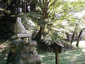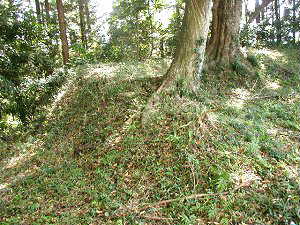 (す)の位置にある弘法大師の像。この城址にはあちこちに石像が置かれている。正面奥に見えているのは3郭の南側に張り出した城塁。 4郭の周囲には高さ2mほどのしっかりとした土塁が巡らされている。 |
