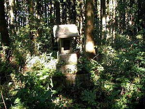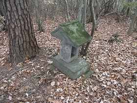 3郭には神社もあるが、ここもかなりの薮状態である。神社の東側に2mほど高く、方6mほどの櫓台があり、そこには写真の祠がある。この櫓台の部分と1郭側との出っ張りとの間に、木橋か何かが置かれていたのではないかと思う。 |
