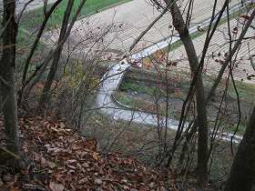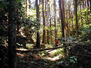 | さて、北側の尾根まで踏査した後、戻ってきて3郭の西側の尾根を歩いてみた。図の(う)の辺りから下の空堀を見た所。写真手前の小枝で隠れている部分に堀切がある。 やはり隊長は、堀の先に進んでしまっている。どこに行っても隊長は先にいるのだ。彼を追い抜くことは不可能なのか!? |