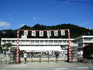 伊王野氏の居館は、下の伊王野小学校にあったという。この小学校は周囲より2mほど高いところにあり、小学校の背後には土塁がよく残っている。石碑も背後にある。ただし、館の案内板は正門の脇に建っていた。 この写真は一見何の変哲もない運動会のスナップのように見えるが、別に運動会を撮ろうとしたわけではない。伊王野城をバックにして館跡を撮ると、自然とこういう写真になってしまうのである。 |