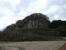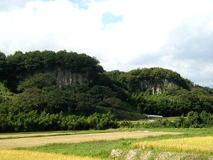 (以前の記述)館山城は、芦野館の南500mほどの所にある。芦野城からは南西1000mほどの所にあたる。写真のとおりの非常に目立つ山なので、場所はすぐ分かるであろう。この2つの峰の間を入っていくような道があり、上に登ることはできるらしいが、たいして遺構らしいものもないということである。石の切り出しなどで、山全体がかなり削られてしまっている。芦野氏は応永年間に館山城を築き、ここに移ったといわれるが、芦野城の項で述べている通りに、天文年間には芦野城を築いて本拠をそちらに移した。以後、幕末まで芦野氏の居城は芦野城となる。 また、館山城と東に向かい合っている辺りの台地中腹に芦野家歴代の墓所がある。そこにはなかなか風情のある五輪塔が建っている。 |