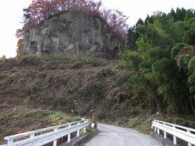 | 東側から見た館山城。周囲をすっかり削られてしまっているので、ものすごい要害に見える。しかし、これは芦野石の採取によるものであり、城本来の形状ではない。 | 橋を渡ると左手に道が続いているが、こちらは途中から立入禁止になってしまっているので通れない。だが正面右手の山林の中の斜面を少しよじ登れば、山頂まで続く道の所に出ることができる。 |