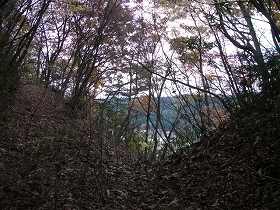 | 3郭と1郭との間の堀切。深い。斜面も急峻であるが、とりあえず1郭側に行くためにはここを降ってまた登るしかない。この城は竪堀が深く、堀切の脇を通ろうとしても、斜面にまでも比高差があるため、薮でなくても通行が大変なのである。 |