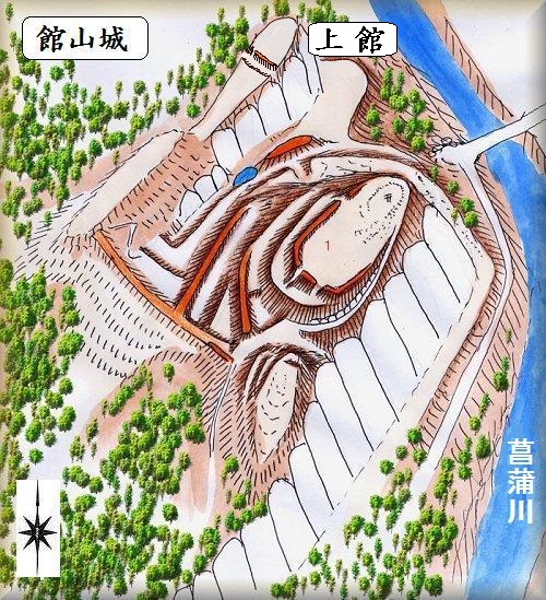 上の段西端にある1郭はL字型の郭であるが、ここが上の段では最大の郭で南北35m、東西30mほどある。北側には深さ4m幅6mほどの堀切があり、その先にも小郭が段々に続く。鳥瞰図では左下の部分が切れてしまっているが、この下にも数段の郭がある。