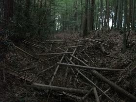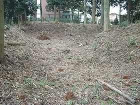 北側の山林内部には、深さ4m、幅6mほどのしっかりとした堀が東西にしっかりと残っている。この外側には土塁が延びており、さらに外側に堀を備えた二重堀構造であったようである。