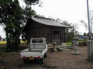 確かに高さ3mほどの円形の大規模な土手が水田中に残っており、その上には神社が祭られている。